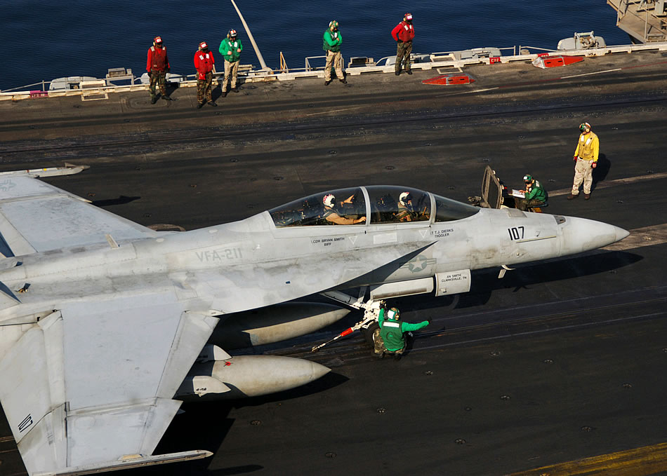 Related StoryPERSIAN GULF (Sept. 30, 2007) - Flight deck personnel perform a pre-launch check on a F/A-18F Super Hornet attached to the "Checkmates" of Strike Fighter Squadron (VFA) 211, aboard the nuclear-powered aircraft carrier USS Enterprise (CVN 65). Enterprise and embarked Carrier Air Wing (CVW) 1 are currently underway on a scheduled six-month deployment. U.S. Navy photo by Mass Communication Specialist Seaman Apprentice Tracey L. Whitley