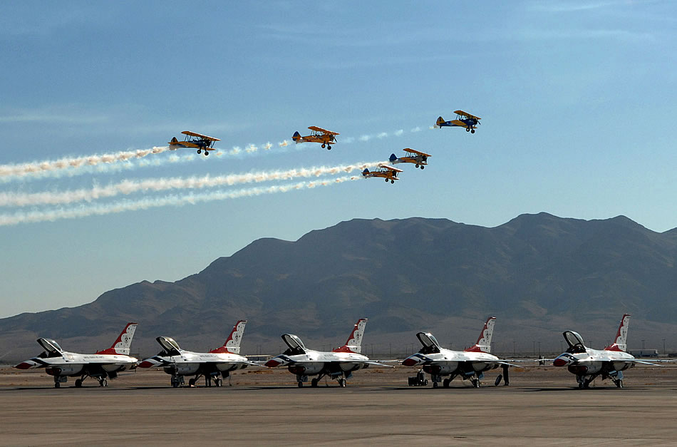 Five vintage aircraft put on their own aerial demonstration as the Air Force Thunderbirds wait their turn Nov. 10 during the Aviation Nation Air Show at Nellis Air Force Base, Nev. Aviation Nation is one of the largest air shows in North America. (U.S. Air Force photo/Staff Sgt. Jeremy Smith)