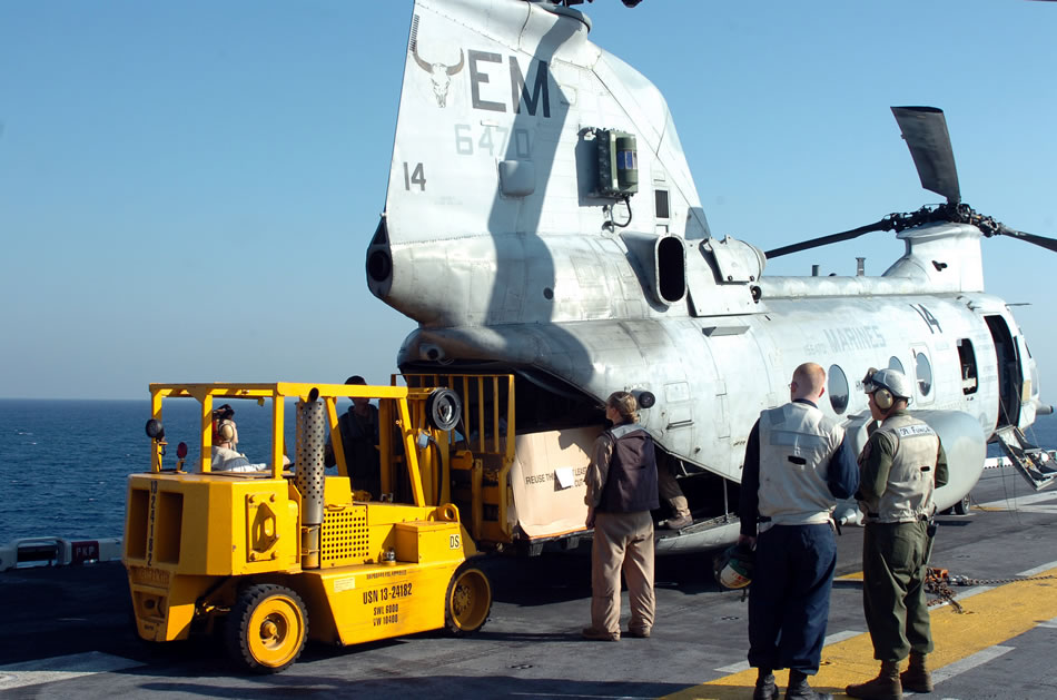 Related ArticleBAY OF BENGAL (Nov. 26, 2007) Sailors and Marines aboard the amphibious assault ship USS Kearsarge (LHD 3) help load crates of water onto a CH-46 Sea Knight helicopter for distribution in Bangladesh. Kearsarge and the embarked 22nd Marine Expeditionary Unit are conducting humanitarian assistance and disaster relief efforts in response to the government of Bangladesh's request for assistance after Cyclone Sidr struck their southern coast Nov. 15. The Department of Defense effort is part of a larger United States response coordinated by the U.S. Department of State and U.S. Agency for International Development. U.S. Navy photo by Mass Communication Specialist Seaman Ash Severe