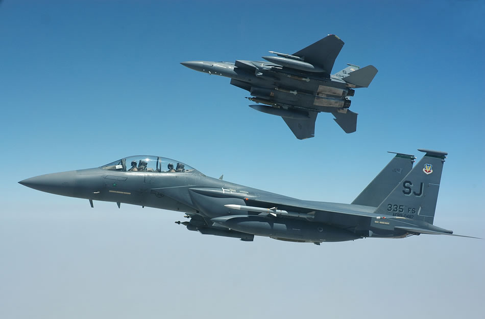 Air Force F-15E Strike Eagles cover the skies over Southwest Asia. F-15Es provide close-air support for Operation Enduring Freedom. Coalition aircraft flew 40 close-air-support missions for OEF June 12. (U.S. Air Force photo.)
