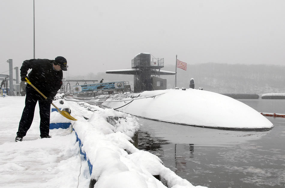 GROTON, Conn. (Feb. 22, 2008) Storekeeper 2nd Class Mike Hyatt shovels off the pier next to the Los Angeles-class fast-attack submarine USS Philadelphia (SSN 690) on a blustery, snowy morning. A snowstorm arriving earlier than predicated caused problems across the region and Sailors on Naval Submarine Base New London had to work hard to keep up with it. U.S. Navy photo by John Narewski